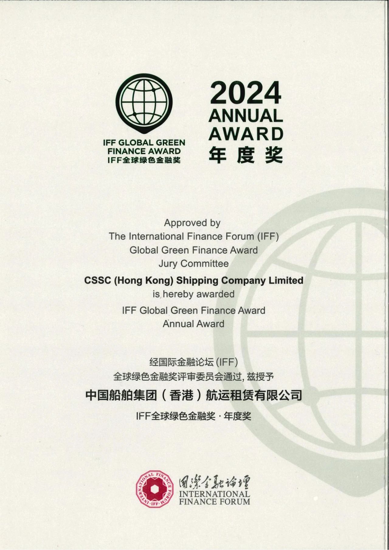 日前,在中国香港举行的国际金融论坛(IFF)第21届全球年会(F20峰会)上,发布了第五届“IFF全球绿色金融奖”评选结果。中国船舶集团中船租赁凭借其在绿色金融领域综合实践的杰出表现,首度荣膺“IFF全球绿色金融奖——年度奖”。这是继2021年获得“IFF全球绿色金融创新奖”,中船租赁再上一层楼,荣获年度大奖。