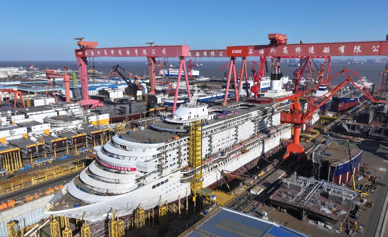 1月15日,第二艘国产大型邮轮“爱达·花城号”在中国船舶集团旗下外高桥造船实现全船贯通的里程碑节点,全面转入全船内装工程、设备、系统调试下半场。