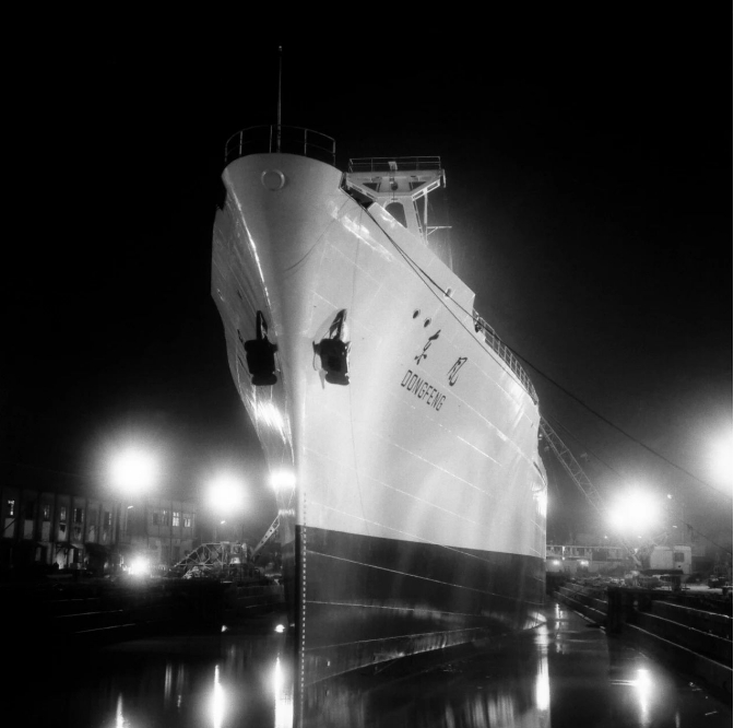“一五”后期,研制万吨级远洋货船被列为国家新科技规划的重点项目。在西方长期封锁尤其是后来苏联中止援助的困难局势下,“东风”号是中国人首次尝试自行设计、自行建造,全部采用国产设备的首艘万吨远洋船。1960年4月15日,“东风”号下水,时任上海市委书记陈丕显、副市长曹荻秋等人出席下水典礼。万吨轮被命名为“东风”号。