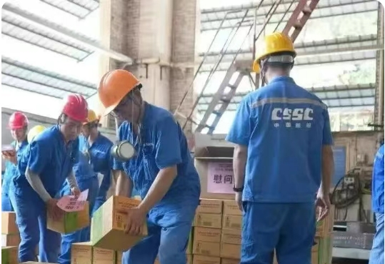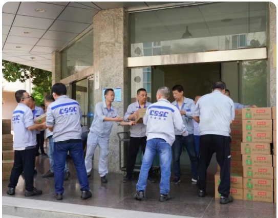 为应对持续高温天气,中船物资全面部署防暑降温工作,切实保障一线员工健康安全。下属各子公司严格落实安全生产责任,组织专项安全检查,强化作业现场安全管理;结合不同岗位作业强度,科学制定防暑降温方案,并通过安全教育提升员工应急处置能力。同时,积极开展“关爱员工送清凉”慰问活动,为一线员工发放藿香正气水、清凉饮料等防暑物资,并升级改造员工休息室,改善高温作业环境。
