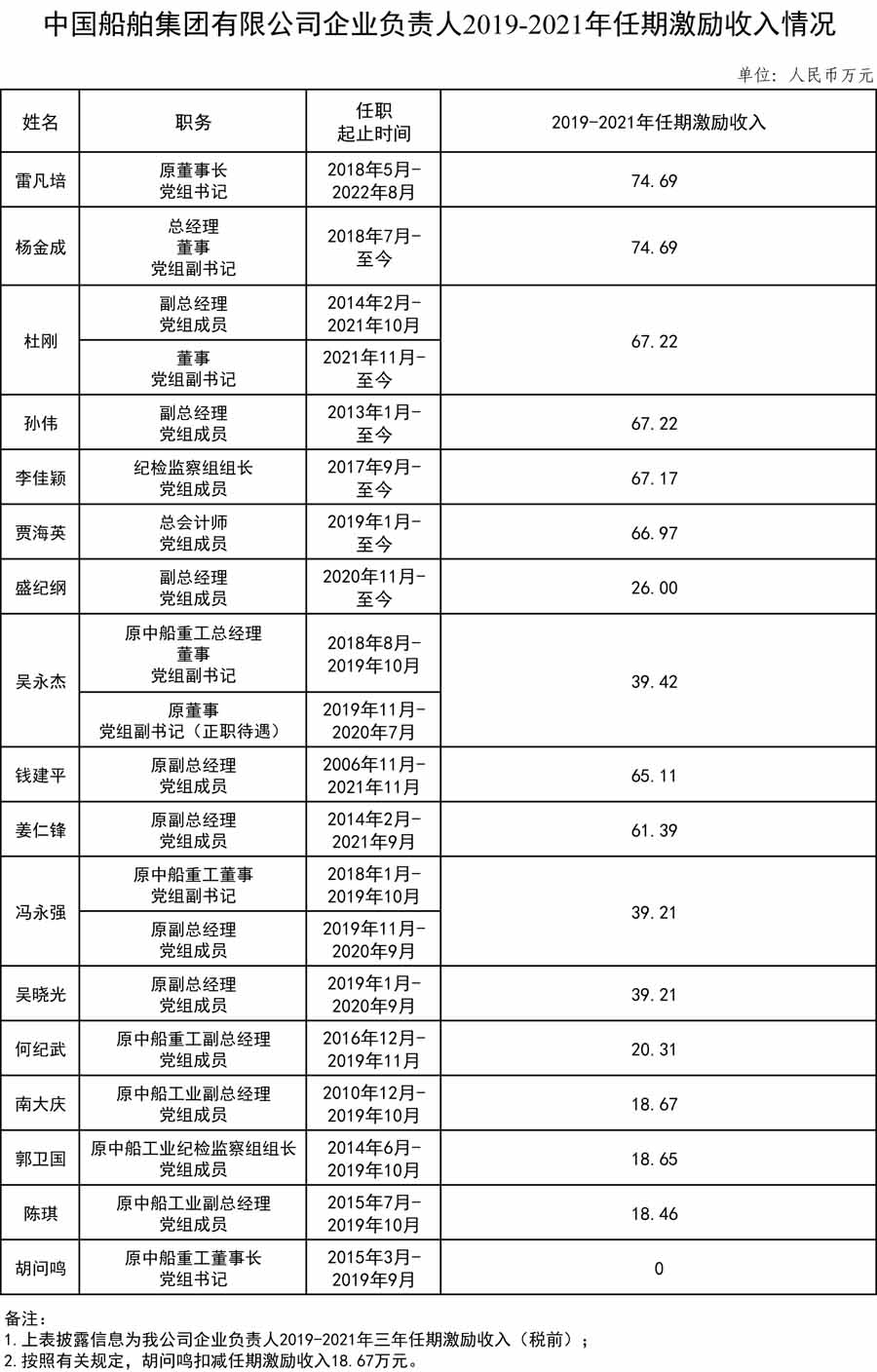 中国船舶集团有限公司企业负责人2019-2021年任期激励收入情况