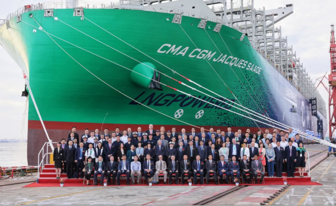 9月22日,由中国船舶集团有限公司旗下沪东中华造船(集团)有限公司和中国船舶工业贸易有限公司作为联合卖方为世界著名航运公司——法国达飞海运集团建造的全球首艘23000TEU双燃料动力集装箱船“达飞雅克?萨德”号,在上海长兴岛造船基地命名交付。中国船舶集团副总经理孙伟、达飞海运集团董事会主席鲁道夫·萨德出席仪式并致辞,教母谭雅·萨德为新船命名,法国驻沪总领事纪博伟应邀出席仪式。