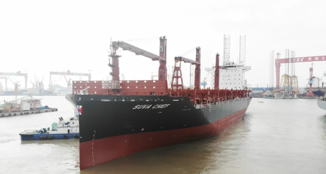 1月4日上午,交付的“SUVA CHIEF”号,这是黄埔文冲携手中船贸易为新加坡太古公司建造的2750TEU集装箱船3号船。