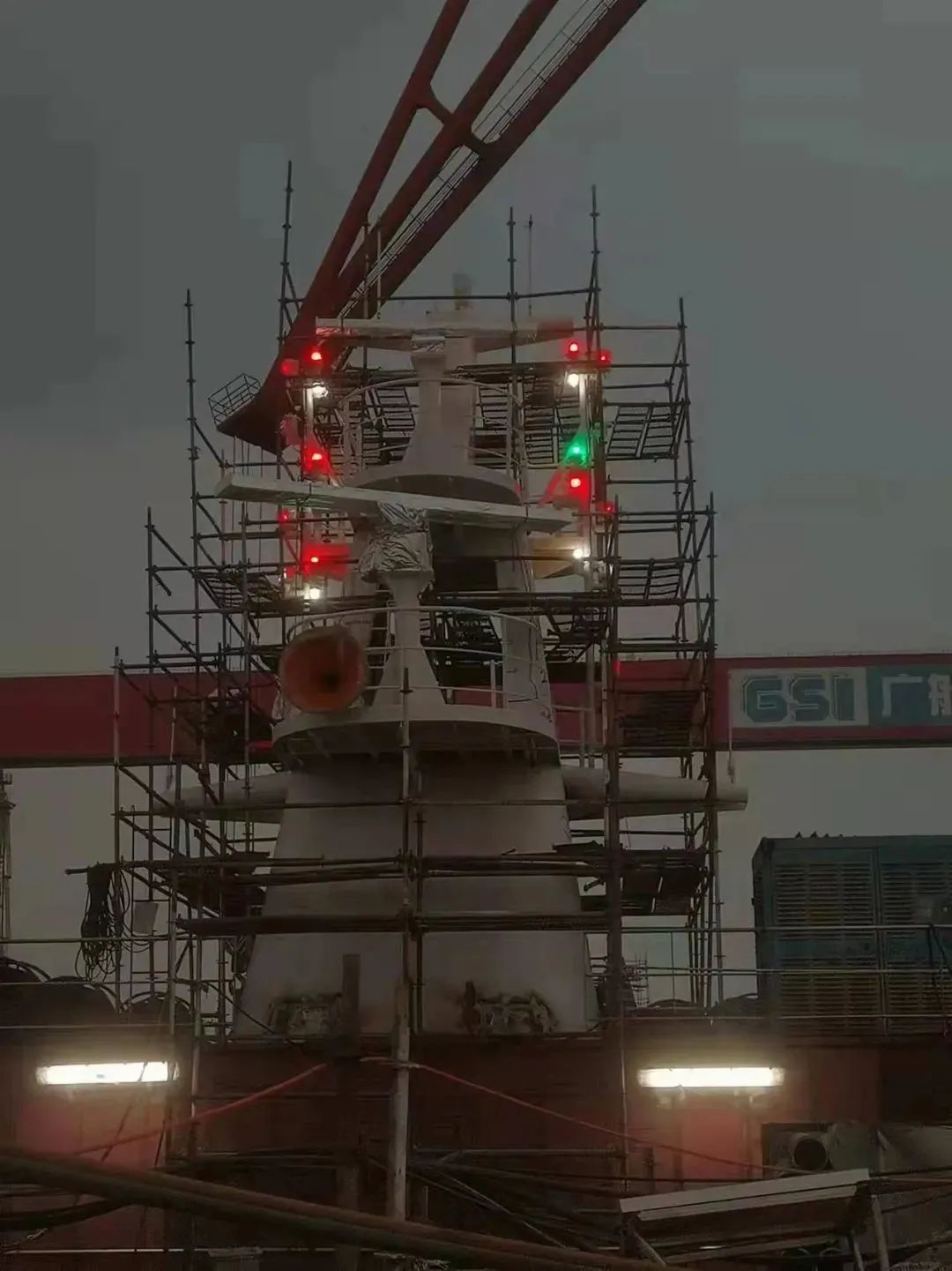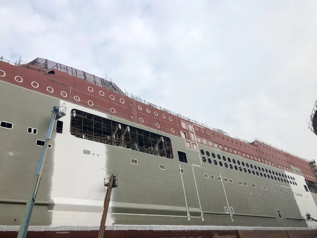 该船实现了出坞前上建亮灯。电缆拉放完成率87.8%,作为全球最大的豪华客滚船,该船全船电缆长度达到了946公里(相当于从广州到重庆);出坞前已完成了830公里电缆的拉放工作。涂装完整性实现突破,该船出坞时上层建筑上方仍有部分区域未完成涂装? 这是因为该船垂直高度已接近40米,超过了船坞高空车的最大极限。