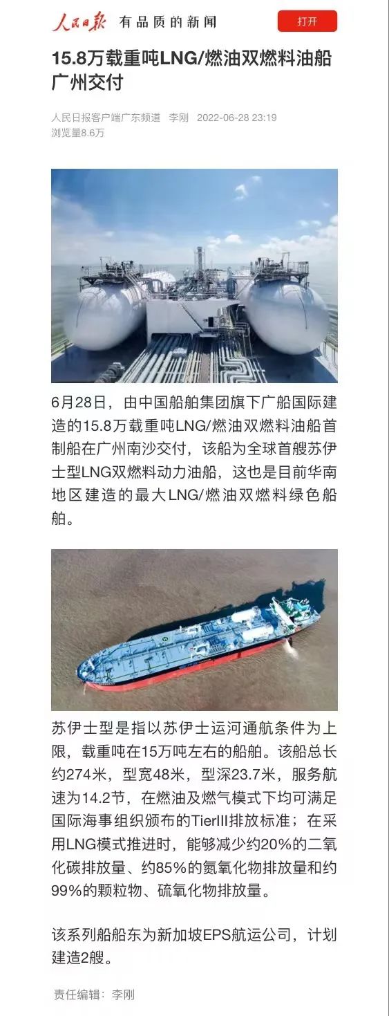 2022年5月30日交付,标志着广船国际成功攻克LNG双燃料动力船舶的研发和建造技术,成为了华南地区首家自主研发和建造LNG双燃料成品油船的船企。