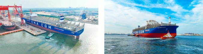 6月23日,大连造船大船天津建造的甲醇双燃料动力15000TEU集装箱船出坞。