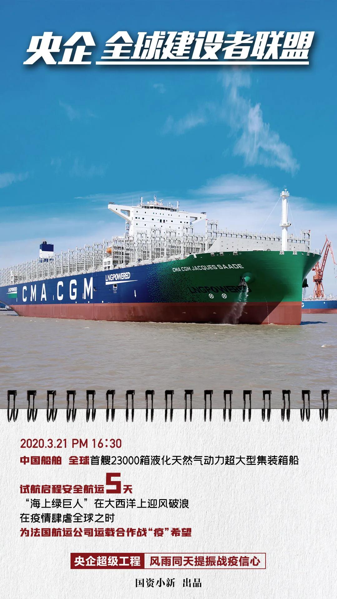 ????今天,国资小新发布图文消息《央企全球建设者联盟:风雨同天提振国际合作战疫信心!》。开篇提到中国船舶集团所属沪东中华建造的全球首艘23000箱液化天然气(LNG)动力集装箱船开启常规试航之旅,在疫情肆虐全球之时,为法国航运公司运载合作战“疫”希望。