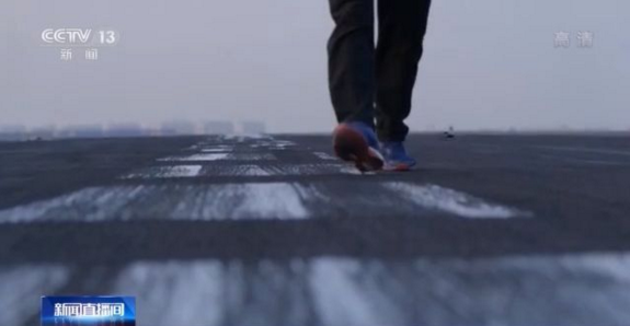 总台央视记者李宁:这个就是在陆地上来模拟航母舰载机着陆的平台。我们在这个地方呆了两天,直到今天日落黄昏,才终于有机会走上这个平台。因为它舰载机训练的频次非常频繁,我们只有在训练的间歇,才有机会带大家来看一下。这里都是黑黢黢的一片,所以这个地方就叫做黑区。这一道道胎印就见证着这支舰载机部队从无到有,一步步成长的过程。