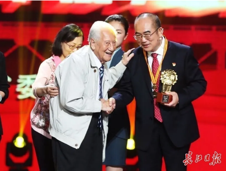 当主持人念出“给‘人民英雄’张定宇颁奖的是‘共和国勋章’获得者黄旭华”时,台下爆发出热烈的掌声。