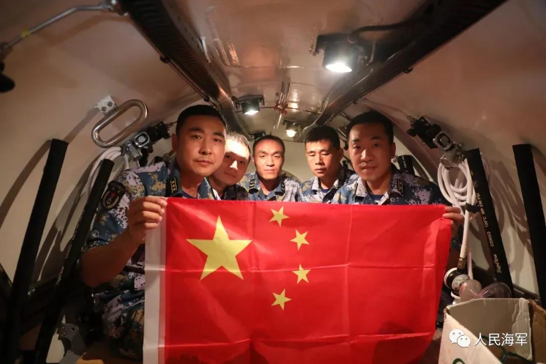 经过2个小时的紧张下潜,深潜救生艇终于到达,并突破指定极限下潜深度,官兵们展开五星红旗骄傲地宣布“我的战位在海底531.1米。