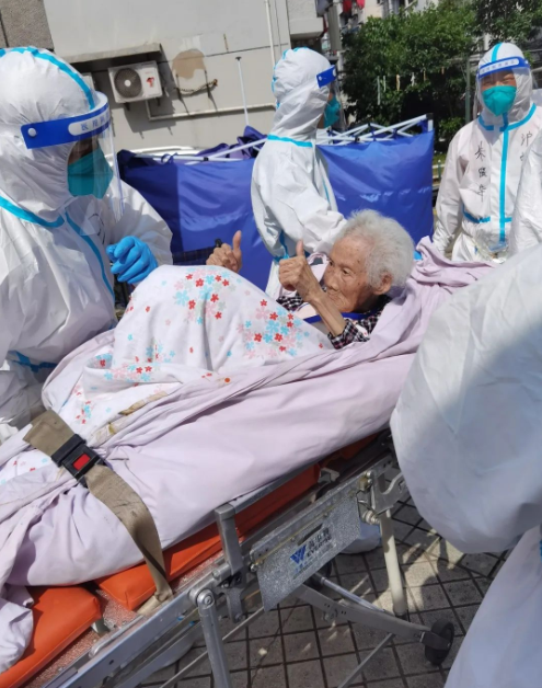“我们是穿着防护服进去的,突然看到这么多‘大白’,老人们不免有些紧张,问的最多的就是‘去哪里’。随着我们一趟趟帮着老人下楼、上车,老人们开始逐渐信任我们。因为转运的部分老人中存在核酸异常的情况,有些老人还会时不时关照我们要注意防护。帮他们送上救护车时,老人还和我们连声表示感谢。”田雪明说道。