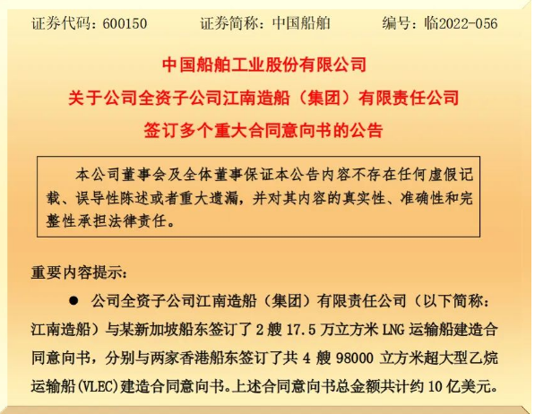10月25日,中国船舶集团有限公司旗下上市公司中国船舶工业股份有限公司发布《关于公司全资子公司江南造船(集团)有限责任公司签订多个重大合同意向书》的公告。根据公告,江南造船共与相关船东签署了2型6艘约10亿美元新船建造合同意向书。