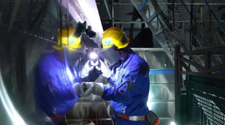 焊接技艺特别考验心态,脚手板的震动、周围的嘈杂都会带来干扰和压力,其他人连续焊接二三十厘米,就需要停下来休息,而杨瑞峰却能一口气完成一米长的焊缝。