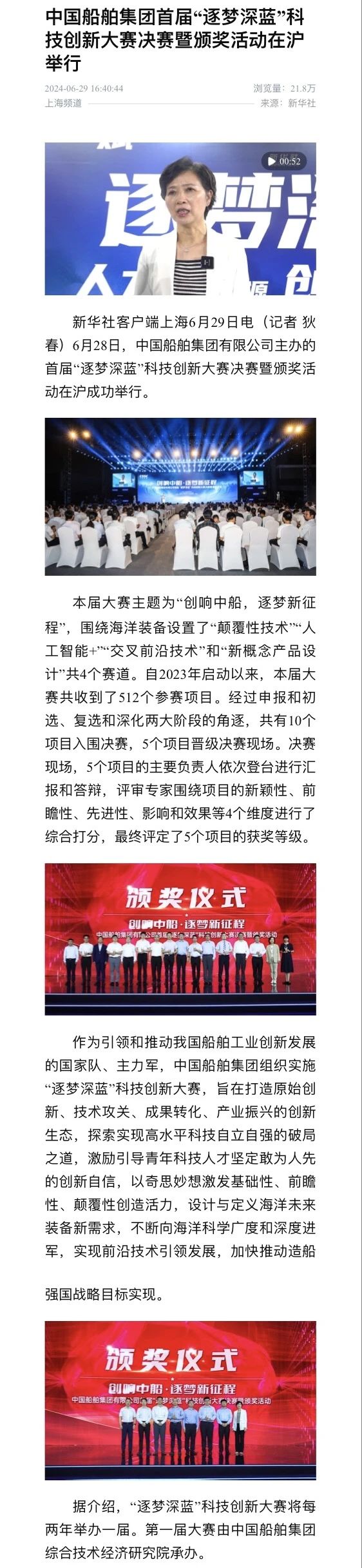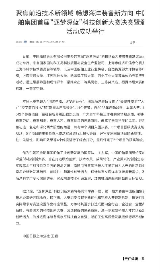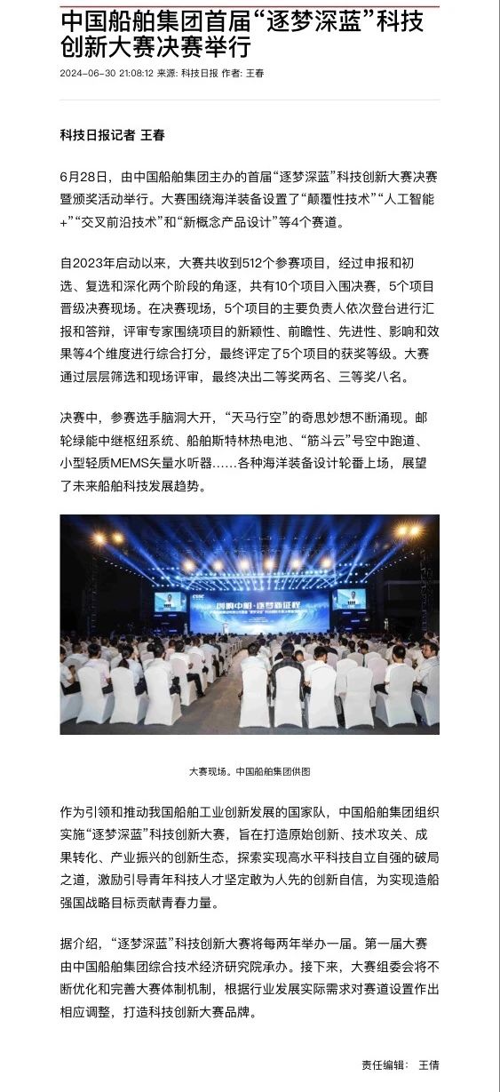 中国船舶集团有限公司主办的首届“逐梦深蓝”科技创新大赛决赛暨颁奖活动引来各大媒体的关注,获得高度评价。——>活动回顾
