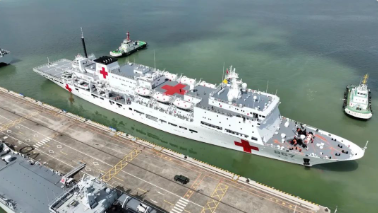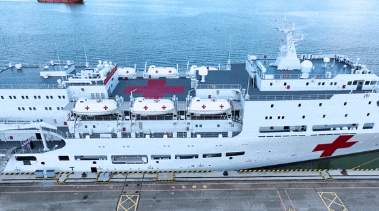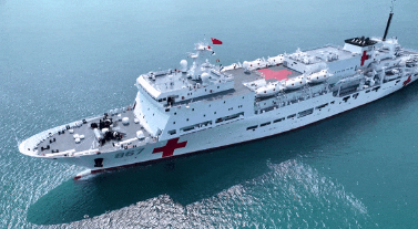 “丝路方舟”号医院船罗吉星介绍:“作为一艘医院船,它具备灵活的机动能力,能够在灾害发生第一时间迅速抵达灾害地区,提供医疗援助服务,还具备多种换乘能力和转移手段,在不具备靠泊条件的灾害地区可以通过直升机和救护艇,将医护人员和医疗物资转运上岸,或者通过同样的方式将我们伤病员转运至医院船进行医疗救治。