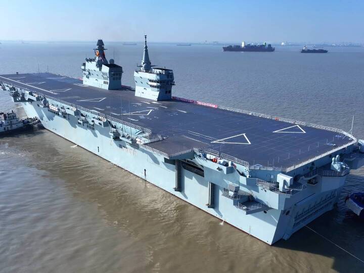 在五艘拖船的牵引下,四川舰离开沪东中华造船厂码头驶向相关海域。四川舰舷号为51,是海军新一代两栖攻击舰,满载排水量4万余吨,设置双舰岛式上层建筑和全纵通飞行甲板,创新应用电磁弹射和阻拦技术,可搭载固定翼飞机、直升机、两栖装备等。