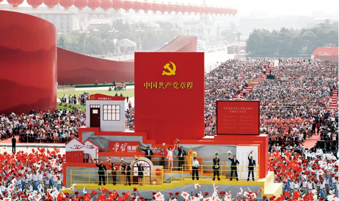 ▲2019年10月1日上午,庆祝中华人民共和国成立70周年大会在北京天安门广场隆重举行。这是群众游行中的“从严治党”方阵。新华社记者 兰红光/摄