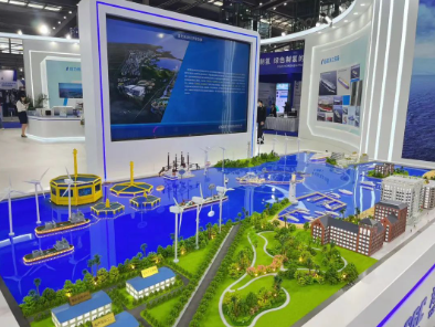 #  10万吨级大型深远海养殖工船、2000吨自升自航式风电安装平台、耕海一号二期工程等模型以及“蓝色海洋经济综合体”沙盘,生动展示出“深海养殖+海上文旅+海上风电”互联互通的繁荣业态景象;