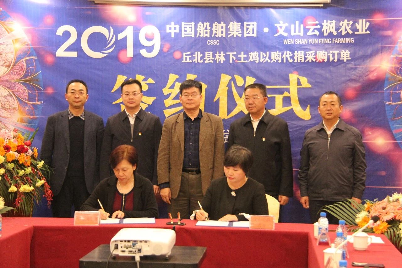 ????12月22日,中国船舶集团有限公司定点扶贫县——云南省文山州丘北县举行中国船舶集团—文山云枫农业丘北县林下养鸡以购代捐采购订单签约仪式。中国船舶集团所属中船物贸公司与云南文山云枫农业签订了价值约1000余万元的10万只土鸡“以购代捐”采购订单。中国船舶集团在丘北县实施的10万只土鸡“以购代捐”项目,历时7个月,进入全面收尾阶段。
